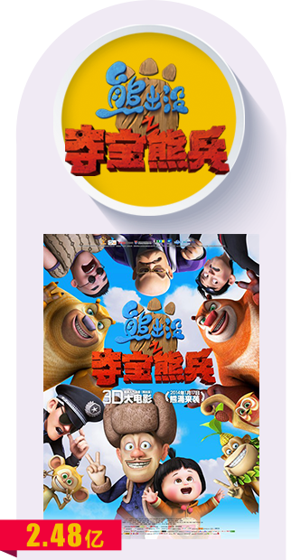 • 2014年首部大電影《熊出沒之奪寶熊兵》正式上映,影片上映首周票房1600萬美元,創造了中國本土動畫片在內地的開畫紀錄,并成為了中國電影史上首部突破兩億的國產動畫電影,終獲票房2.48億元。