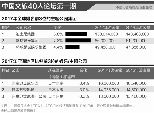 5月17日,在主題娛樂協(xié)會TEA與AECOM聯(lián)合發(fā)布的《2017全球主題公園調(diào)查報(bào)告》中,中國本土主題公園企業(yè)——華僑城集團(tuán)、華強(qiáng)方特及長隆集團(tuán)分別排名第四、第五和第六,游客量增速分別為33%、22%和13%。對比世界前三大主題公園美國迪士尼公司、英國默林娛樂集團(tuán)以及美國環(huán)球影城度假區(qū),2017年年游客量增長趨勢分別為7%,8%和4%。