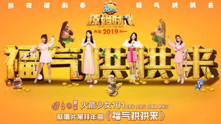 1月16日,新生代女子團體火箭少女101與最強口碑賀歲動畫電影《熊出沒?原始時代》強強聯合,由火箭少女101成員孟美岐、吳宣儀、段奧娟、賴美云合體獻聲的電影片尾曲《福氣拱拱來》在酷狗音樂正式上線。看火箭少女帶領大家一起元氣滿滿喜迎2019新年到!