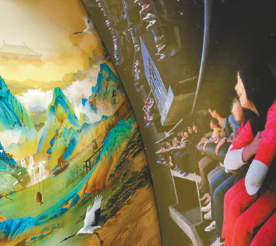 游客在方特主題樂園體驗《飛越千里江山》資料圖片“去年我有幸在故宮‘歷代青綠山水畫特展’上觀賞了中國十大傳世名畫之一的《千里江山圖》,那氣吞山河的氣勢讓人震撼不已,今天沒想到能夠再次領略到這古代青綠山水巔峰之作的美妙意境?!币晃粍傆^看完中國畫球幕飛翔影..