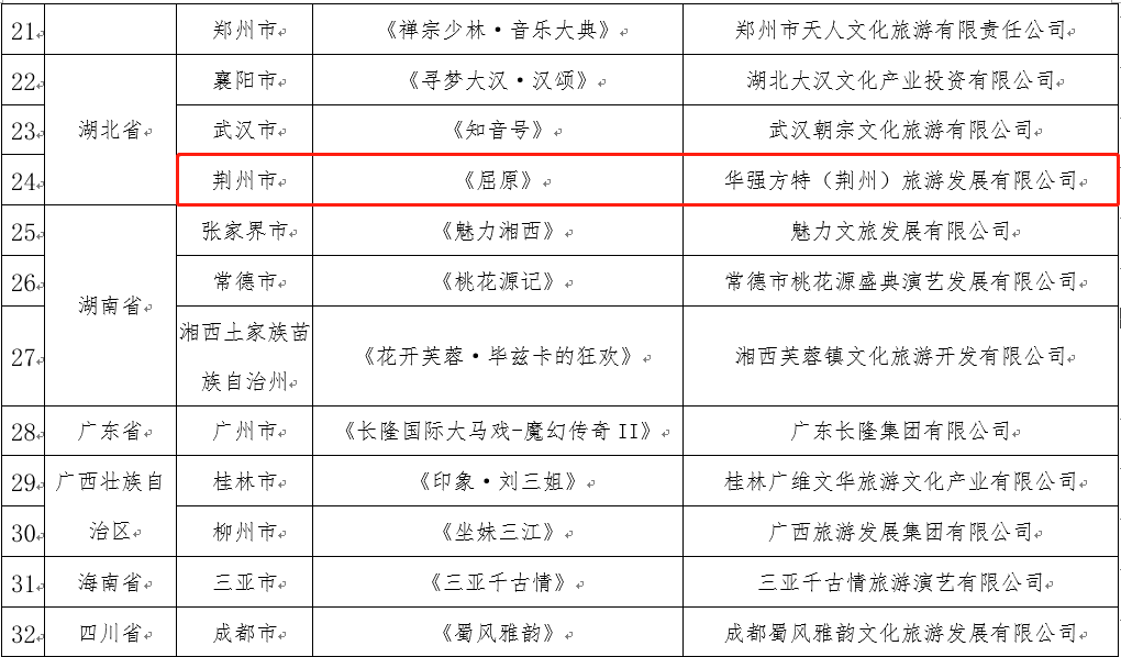 全國旅游演藝精品名錄自去年末開啟申報工作以來,在各省級文化和旅游行政部門推薦的申報項目基礎上,經專家評審層層遴選出各地文化內涵豐富、藝術精湛、社會效益和經濟效益良好的旅游演藝項目,最終在全國范圍內確定了《屈原》等40個入選項目。