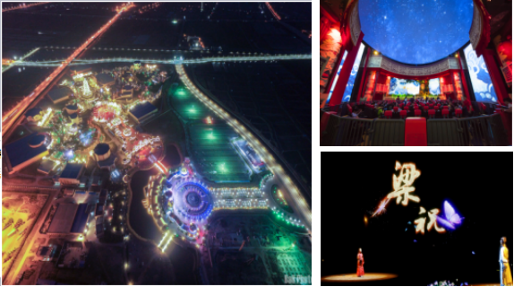 左-寧波方特東方神畫夜景,右上-全景式動態球幕項目《牛郎織女》,右下-全息AR劇場《千古蝶戀》