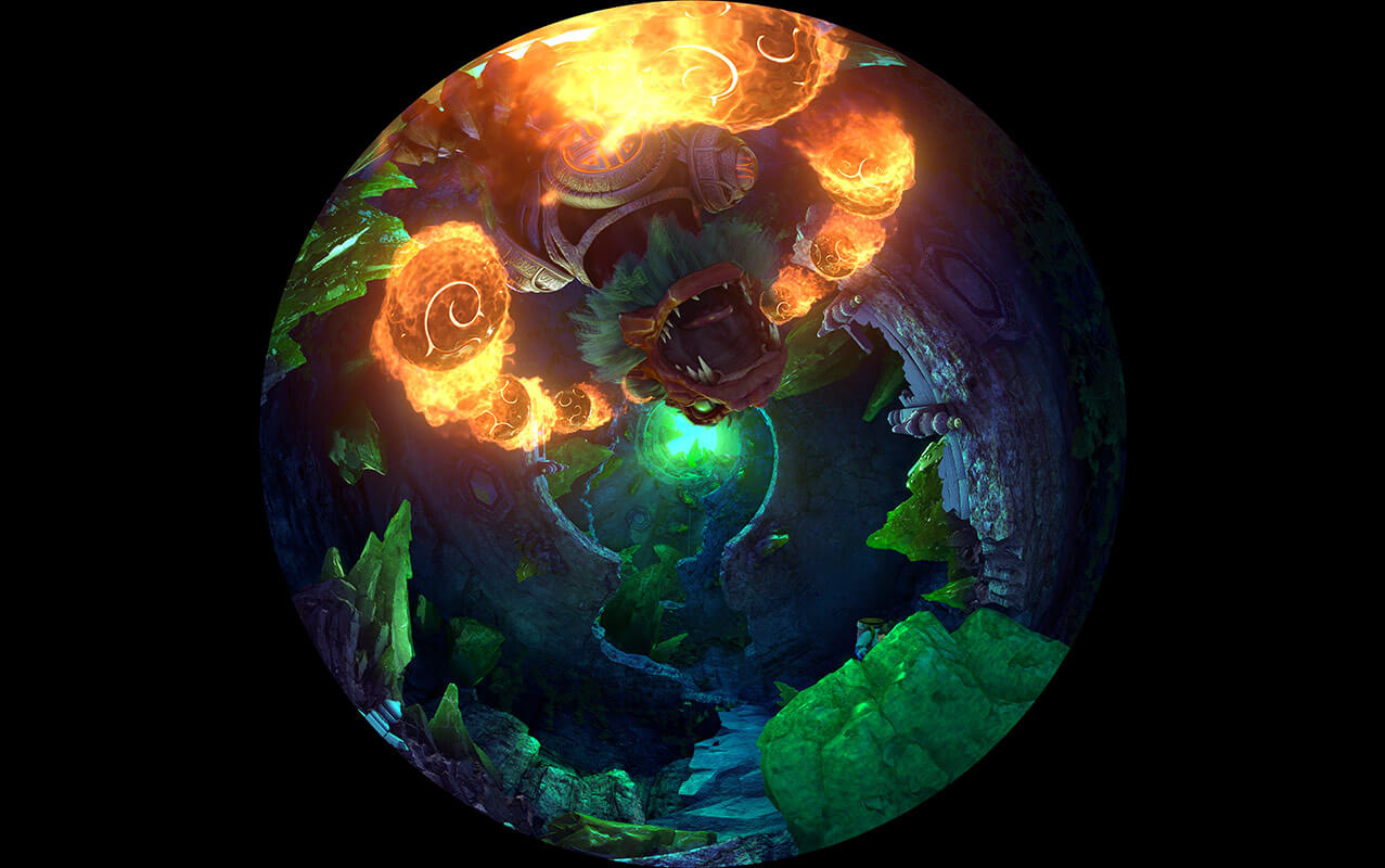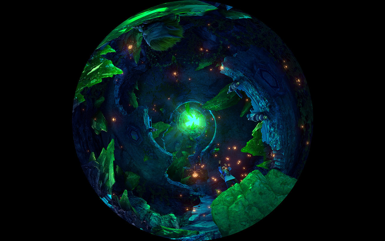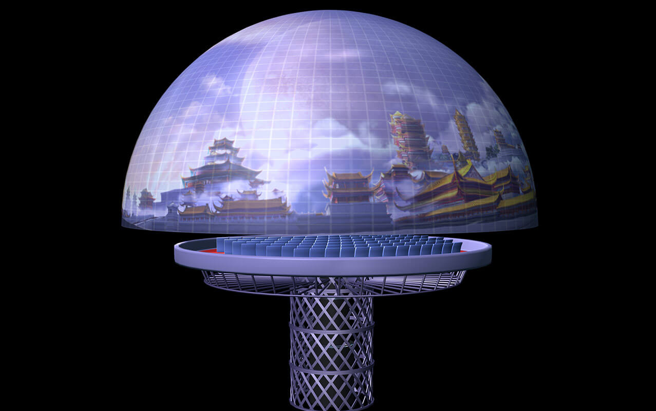 室內升降式穹頂影院主演廳分為兩層,通過大型旋轉升降式平臺連接。一層為多媒體實景舞臺,多種銀幕與實景相結合,二層為穹頂式球幕表演。根據劇情發(fā)展帶領觀眾乘坐超大型提升平臺從一層提升到9米高的二層觀影平臺,結合多種高科技表現手段,創(chuàng)造出震撼的動感體驗。