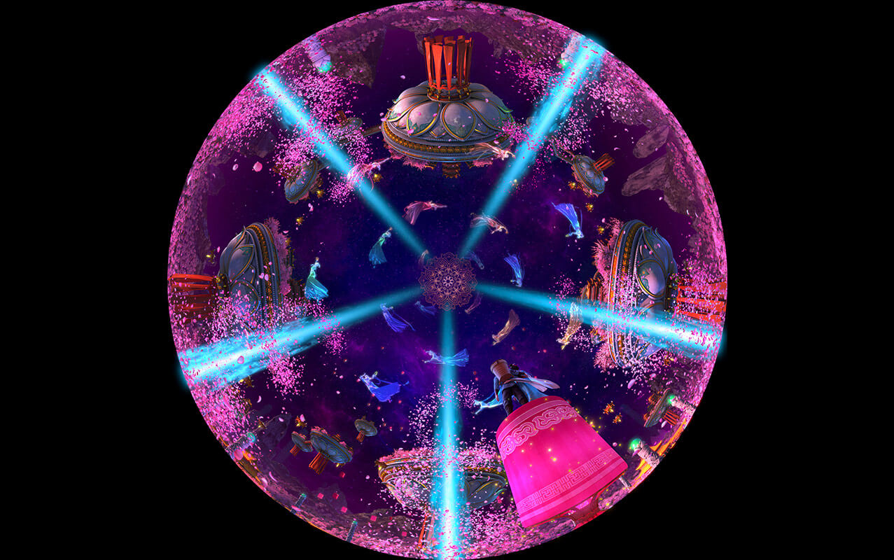 《牛郎織女》項目作為室內升降式穹頂影片的代表。使用真人實拍結合三維的形式,重新演繹經典愛情神話傳說“七夕鵲橋戀”。重點展現了牛郎飛上天庭尋妻,與織女鵲橋相會的情節(jié),并將其打造成為一個恢弘絢麗的魔幻歷險題材主題項目。